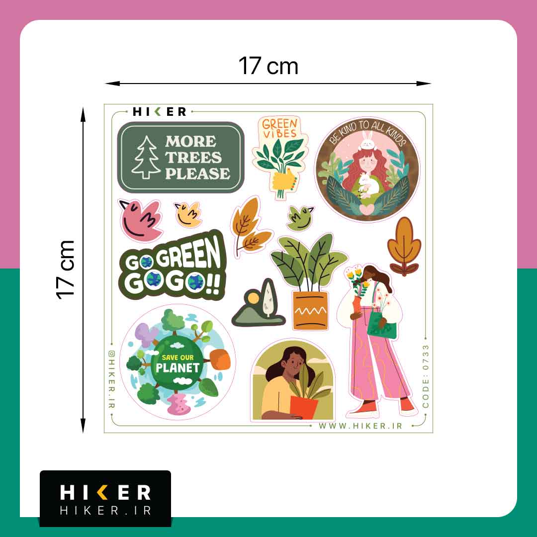 شیت استیکر «سبز باش» با موضوع محیط زیست و طبیعت شامل نوشتههای «More Trees Please»، «Go Green Go Go»، «Save Our Planet»، تصویر گیاهان، برگها، زمین، زنان در حال نگهداری گیاه و پیامهای دوستدار طبیعت است. این استیکرها ضد آب و ضد خش هستند و برای استفاده روی لپتاپ، موبایل، فلاسک، ماشین و وسایل شخصی مناسباند.