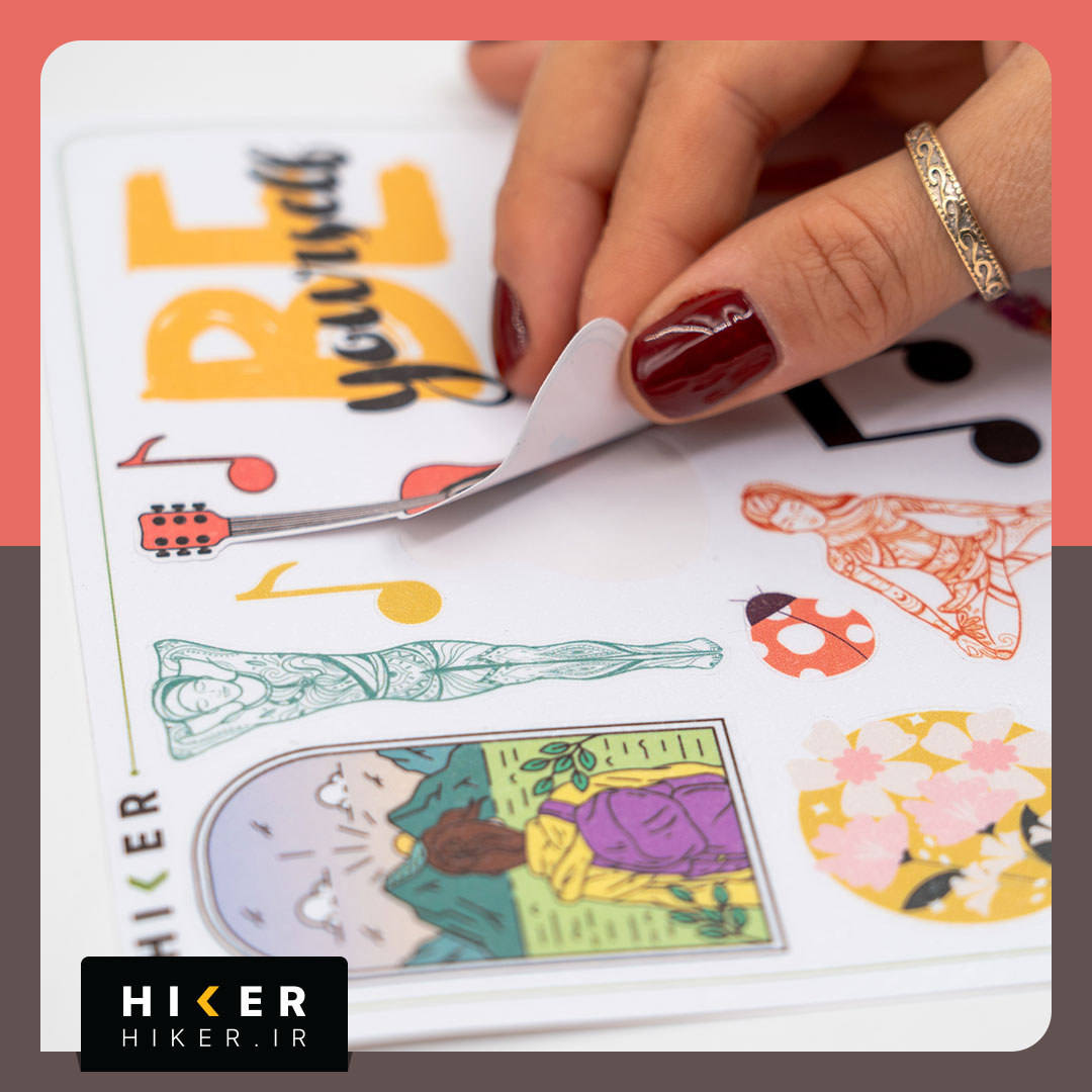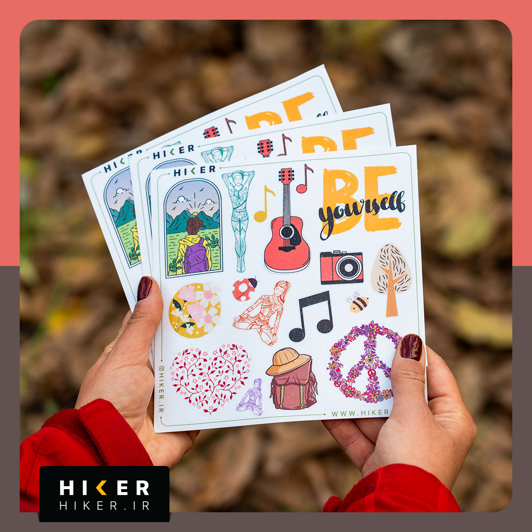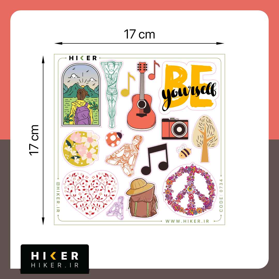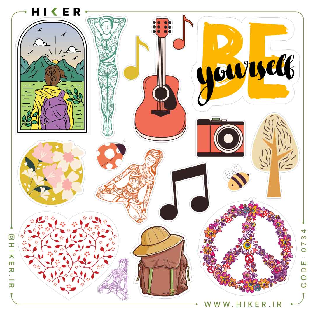 شیت استیکر «همینه زندگی» با طرحهای طبیعت، موسیقی، یوگا، دوربین عکاسی، گل و برگ، نماد صلح، قلب گلدار، کولهپشتی، گیتار و تایپوگرافی «Be yourself» است. این استیکرها ضد آب و ضد خش هستند و برای استفاده روی لپتاپ، موبایل، بطری آب، اسکوتر و وسایل شخصی مناسباند.