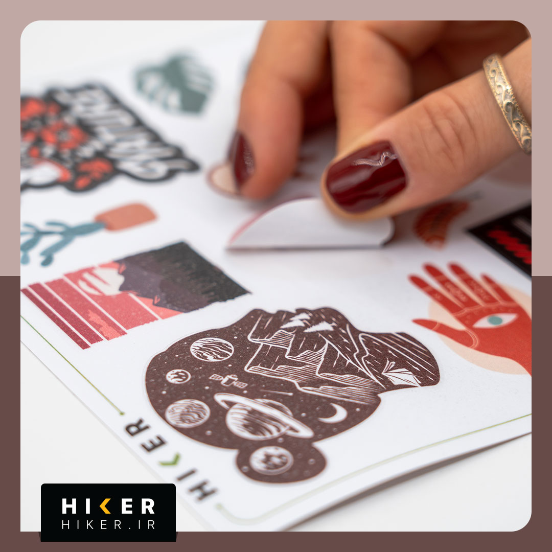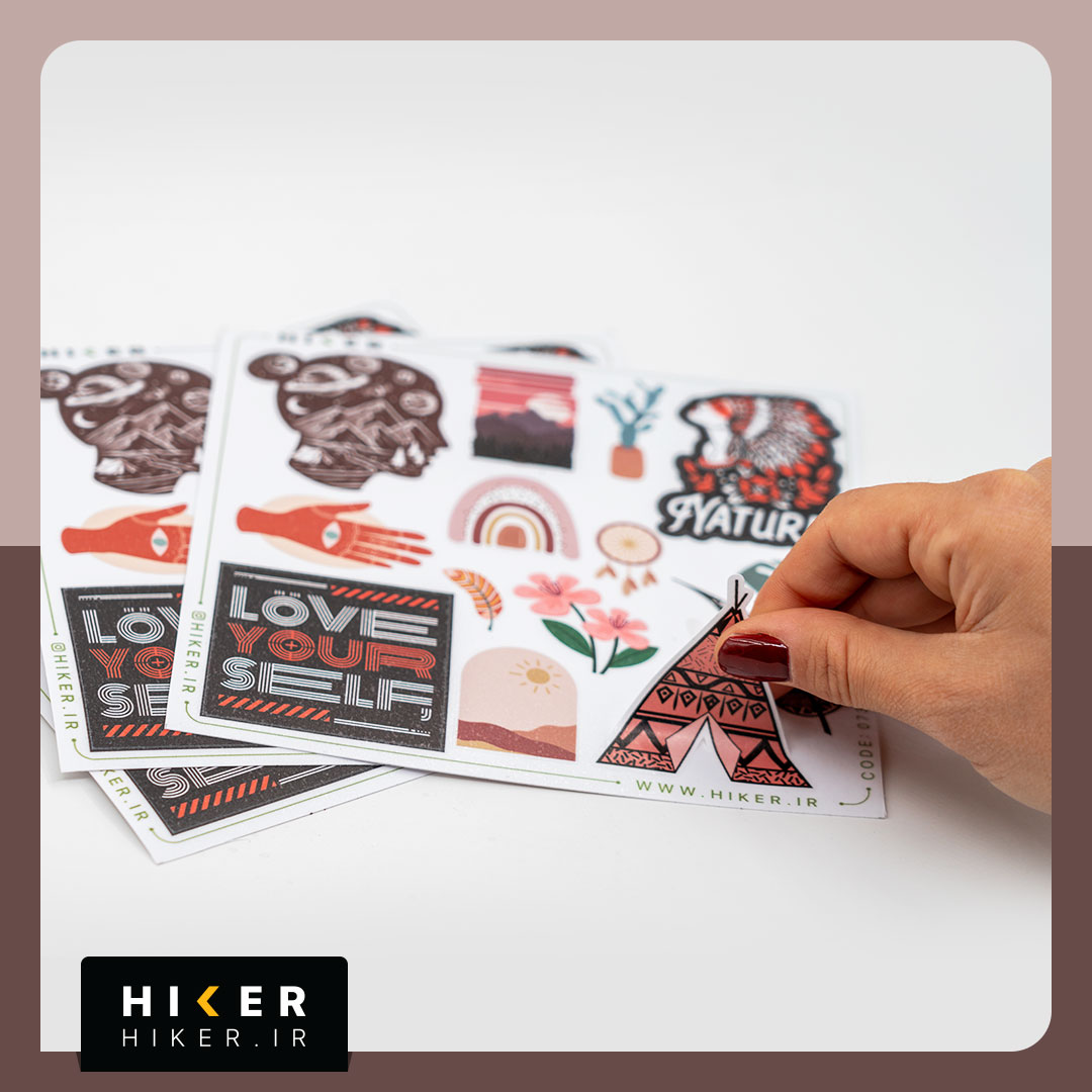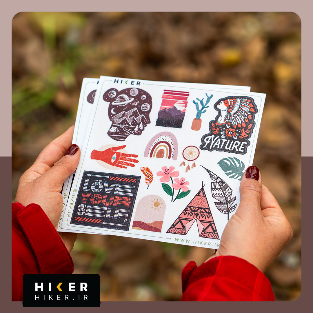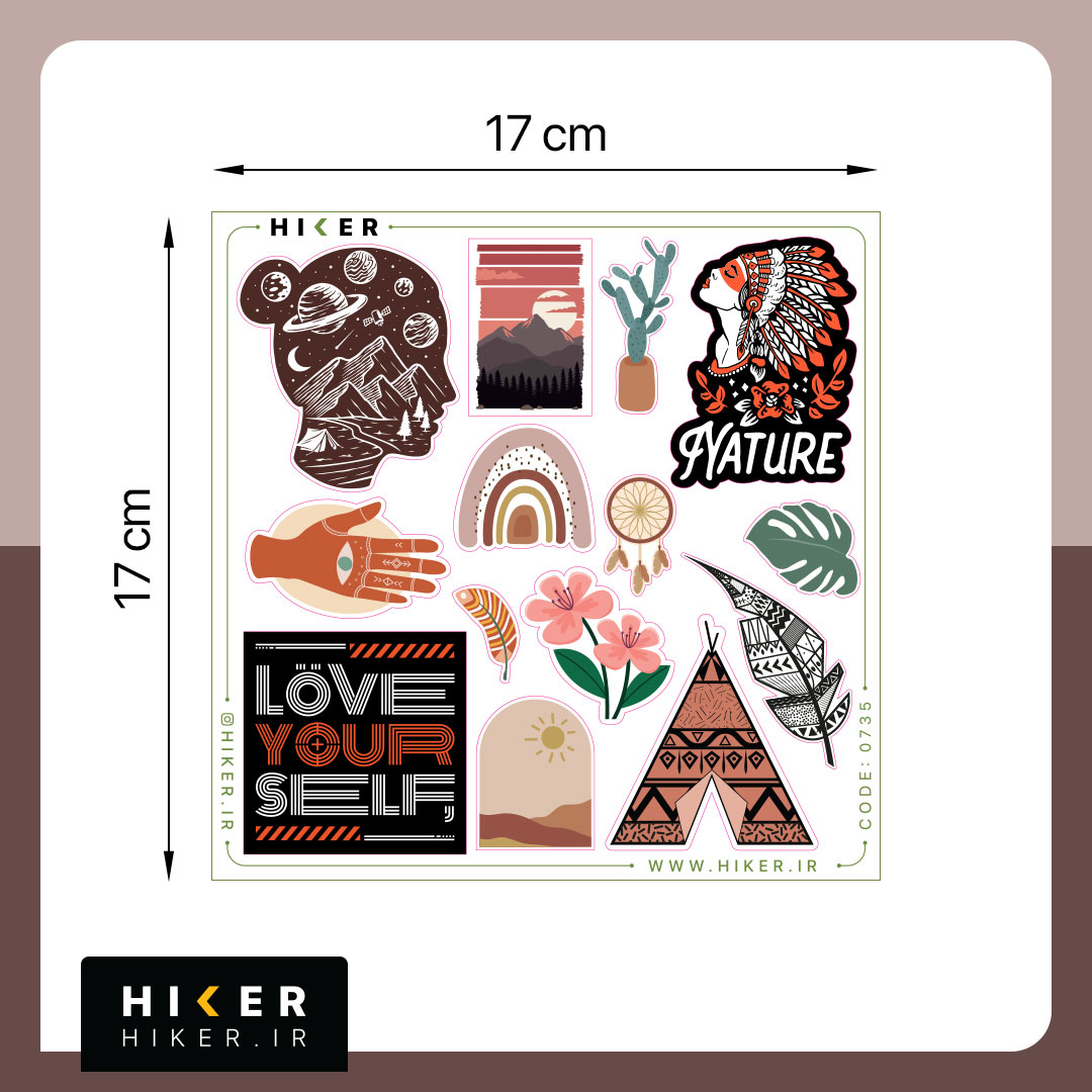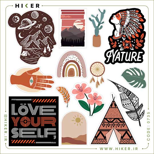بستهی استیکر «بوهو» با طرحهای متنوع الهامگرفته از طبیعت و سبک بوهو؛ شامل چهره با منظره کوه و سیارات، کوهستان، گلها، برگها، کاکتوس، رنگینکمان، چادر سرخپوستی، پر تزئینی و نوشتههای «Nature» و «Love Your Self» است. این استیکرها ضد آب و ضد خش هستند و برای استفاده روی لپتاپ، موبایل، بطری آب، موتور و وسایل شخصی مناسباند.
