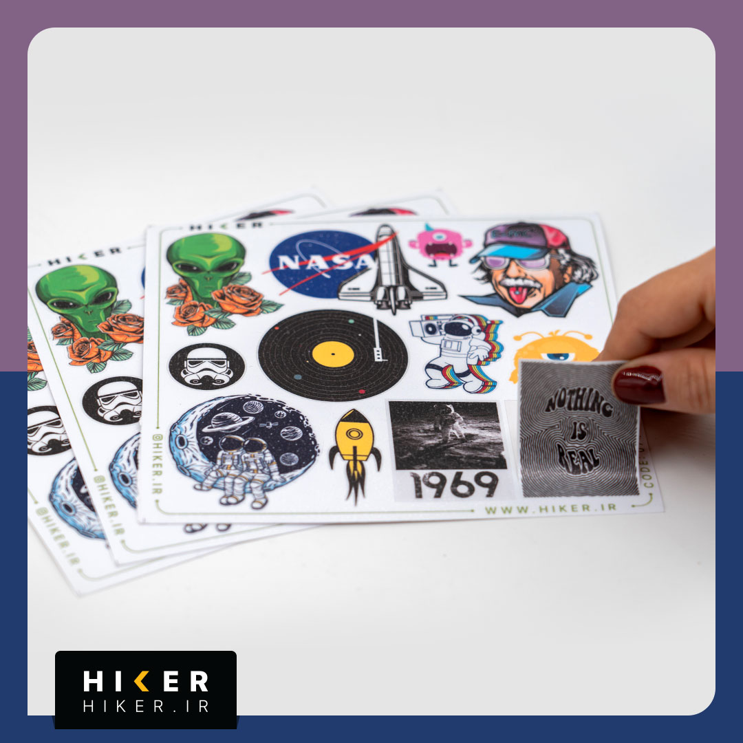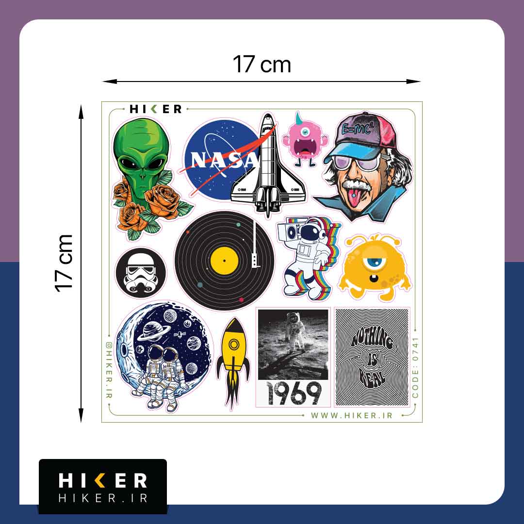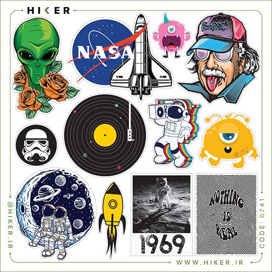 بستهی استیکر «فرازمینیها ۱» با موضوع فضا و علمیتخیلی شامل طرحهای لوگوی ناسا، فضانورد، آلبرت انیشتین با کلاه $E=mc^2$، موجودات فضایی (آدمفضایی)، شاتل فضایی و صفحه گرامافون طرح منظومه شمسی.. این استیکرها ضد آب و ضد خش هستند و برای استفاده روی لپتاپ، موبایل، فلاسک، ماگ، شیشه ماشین و وسایل شخصی مناسباند.