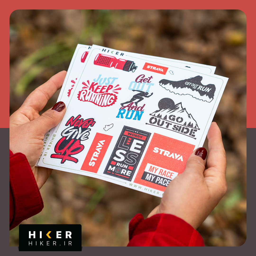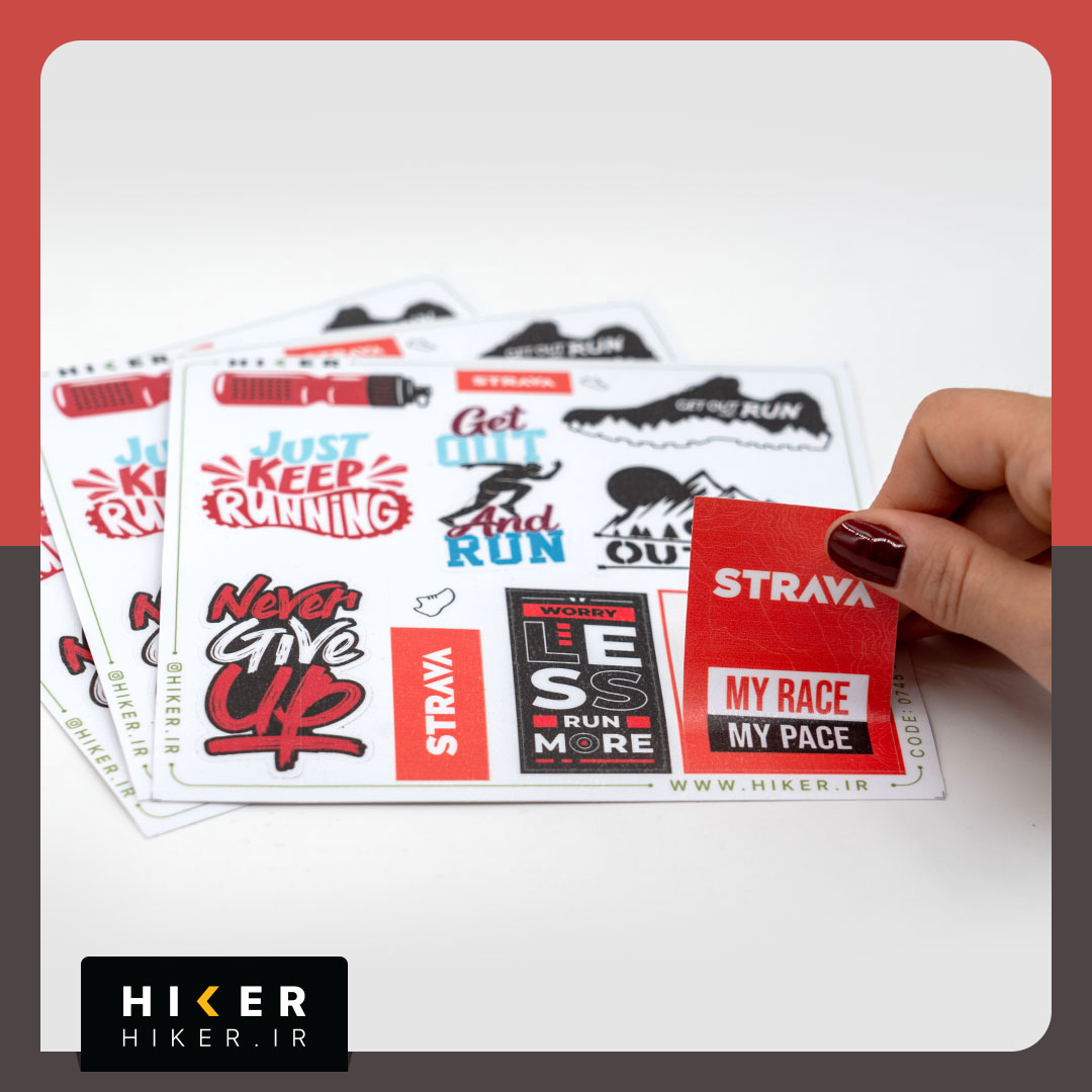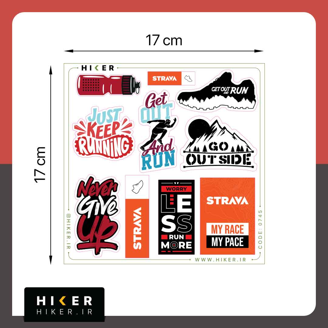 بستهی استیکر «برای دویدن ۱» مخصوص دویدن و تریل رانینگ شامل لوگوی استراوا (Strava)، بطری آب ورزشی، و جملات انگیزشی نظیر Just Keep Running، Never Give Up و Go Outside. این استیکرها ضد آب و ضد خش هستند و برای استفاده روی لپتاپ، موبایل، فلاسک، قمقمه آب و بدونه ماشین و موتور، تجهیزات ورزشی و وسایل شخصی مناسباند.